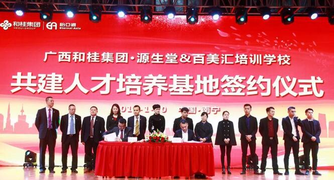 1月20日,源生堂與百美匯培訓(xùn)學(xué)校共建人才培訓(xùn)基地簽約儀式,在廣西和桂集團(tuán)2018年年會(huì)現(xiàn)場(chǎng)隆重舉行。此次簽約標(biāo)志著首個(gè)中國(guó)天然養(yǎng)發(fā)人才培養(yǎng)基地的成立。廣西和桂集團(tuán)總裁黃偉文先生、源生堂執(zhí)行總經(jīng)理舒志華女士、百美匯培訓(xùn)學(xué)校校長(zhǎng)王勇先生等領(lǐng)導(dǎo)出席本次簽約儀式。中央電視臺(tái)、廣西電視臺(tái)、南國(guó)早報(bào)、網(wǎng)易網(wǎng)、中國(guó)網(wǎng)、中國(guó)經(jīng)濟(jì)時(shí)報(bào)、新浪新聞、百度新聞等媒體,以及源生堂供應(yīng)商、加盟商、員工等近千人,共同見(jiàn)證了首個(gè)中國(guó)天然養(yǎng)發(fā)人才基地的簽約儀式。